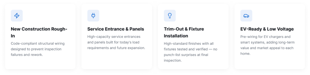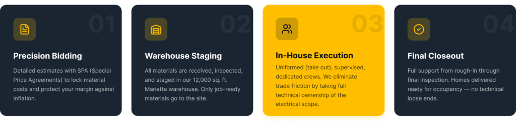 We don’t just pull wire; we deliver certainty. With a 12,000 sq. ft. warehouse, locked material pricing (flexible material pricing), and 100% in-house crews, we keep your projects on schedule and passing inspection the first time.